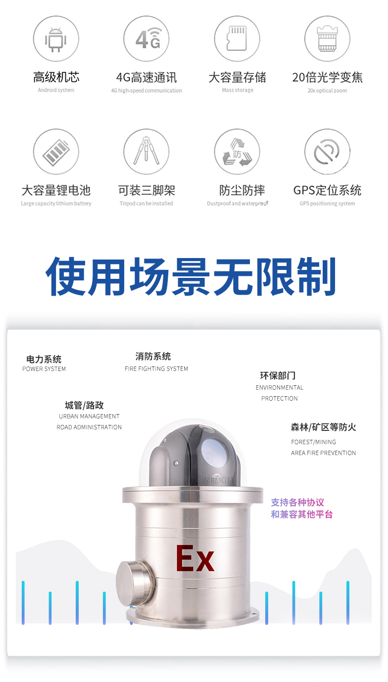 友聯哨兵 ULH-Ss12Ex 防爆布控球是一款具備防爆功能的一體化無線視頻應急指揮系統,專為特定行業(如石油、煉化、化工、燃氣等危險化學和易燃易爆行業)設計。產品內置高清攝像機及高性能鋰電池組,通過無線網絡方式回傳至控制終端,具備防水防震防爆等特性,攜帶便捷,可快速安裝和收納,完全滿足石油、化工等作業區的移動巡檢、無人值守、臨時監控、應急指揮的應用需求。