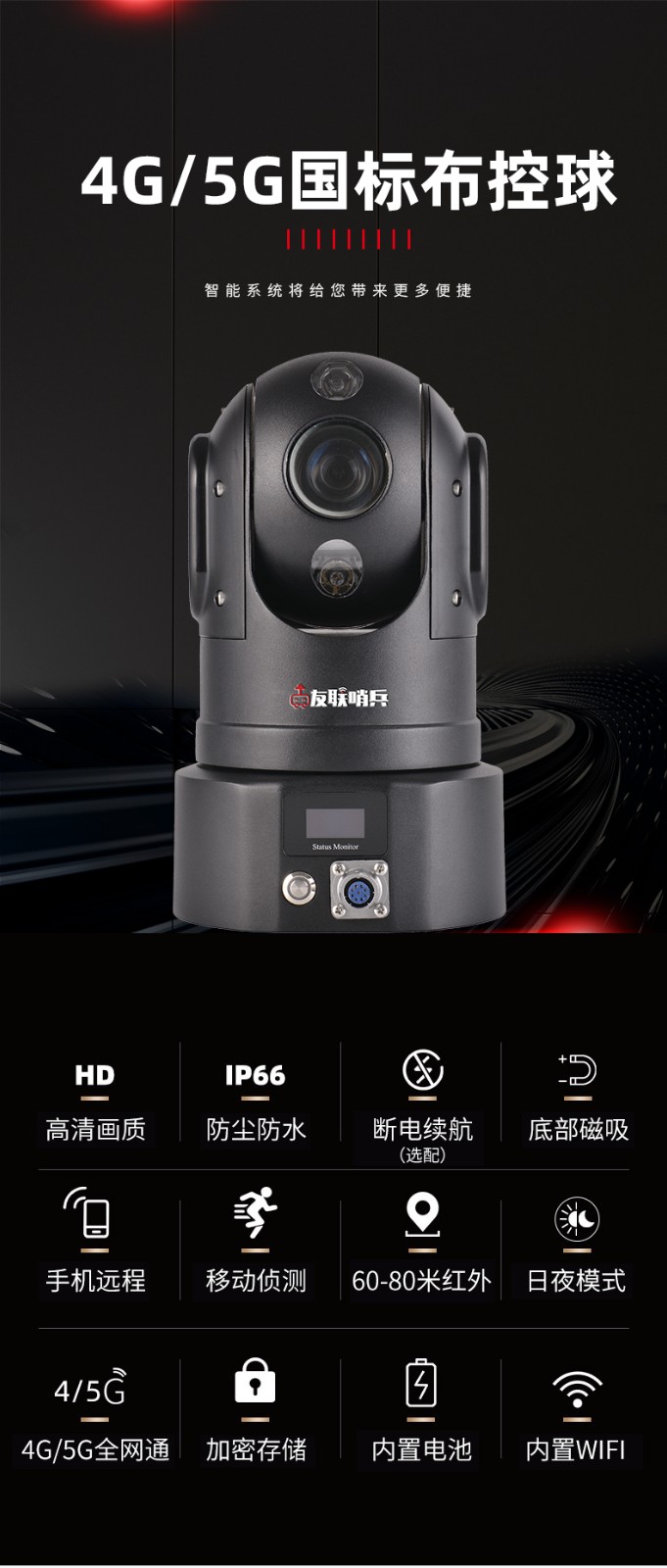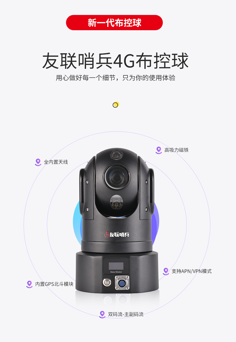 友聯哨兵4G雙卡智能高清布控球(云臺),是集高清晰攝像、無線圖傳、雙向對講、實時定位、遠程回放、云臺操作等多功能于一體的便攜式4G應急布控球產品,超高設備集成度,內置高性能鋰電池組,具備防水防震的特性,底座帶有強磁鐵吸盤,可快速架設于三角支架或車頂等,滿足應急布控及快速安裝的特殊要求。廣泛適用于外勤執法、偵查布控、安防安保、應急指揮、搶險搶修、巡線管理等行業應用,如公安、交警、消防、路政、城管、交通、法院、監獄、林業、電力、水利、環保等單位。