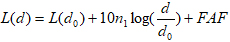 式中,n1 是位于同一樓層上的路徑損耗指數,它取決于建筑物的類型,其典型值是2.8;FAF 是樓層衰減因子,它是樓層數和建筑物類型的函數。